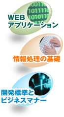 新入社員研修では、「情報処理の基礎」・「開発標準/ビジネスマナー」・「WEBアプリケーションの開発」の3つをテーマに取り組んでいただきます。